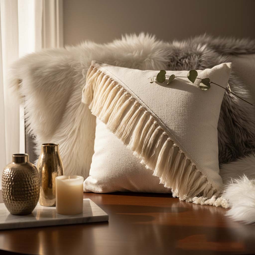 کوسن لینن تریم با طراحی منحصربه‌فرد و ردیف مورب منگوله‌های هم‌رنگ، ترکیبی از سادگی مدرن و جزئیات هنری را به نمایش می‌گذارد. - کوسن از جنس لینن طبیعی - رنگ کرمی ملایم آن، حس آرامش و لطافت را به فضا القا می‌کند، در حالی که منگوله‌های منظم، جلوه‌ای از سبک بوهو و دست‌ساز را به آن می‌افزایند. این کوسن نه‌تنها یک عنصر تزئینی برای مبلمان یا تخت‌خواب است، بلکه با طراحی خاص خود، به‌راحتی می‌تواند نقطه‌ی تمرکز دکوراسیون باشد. لینن تریم انتخابی ایده‌آل برای کسانی‌ست که به دنبال ترکیب ظرافت، بافت و زیبایی در فضای زندگی خود هستند.