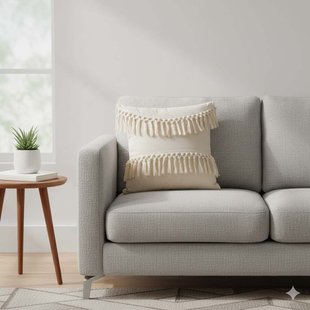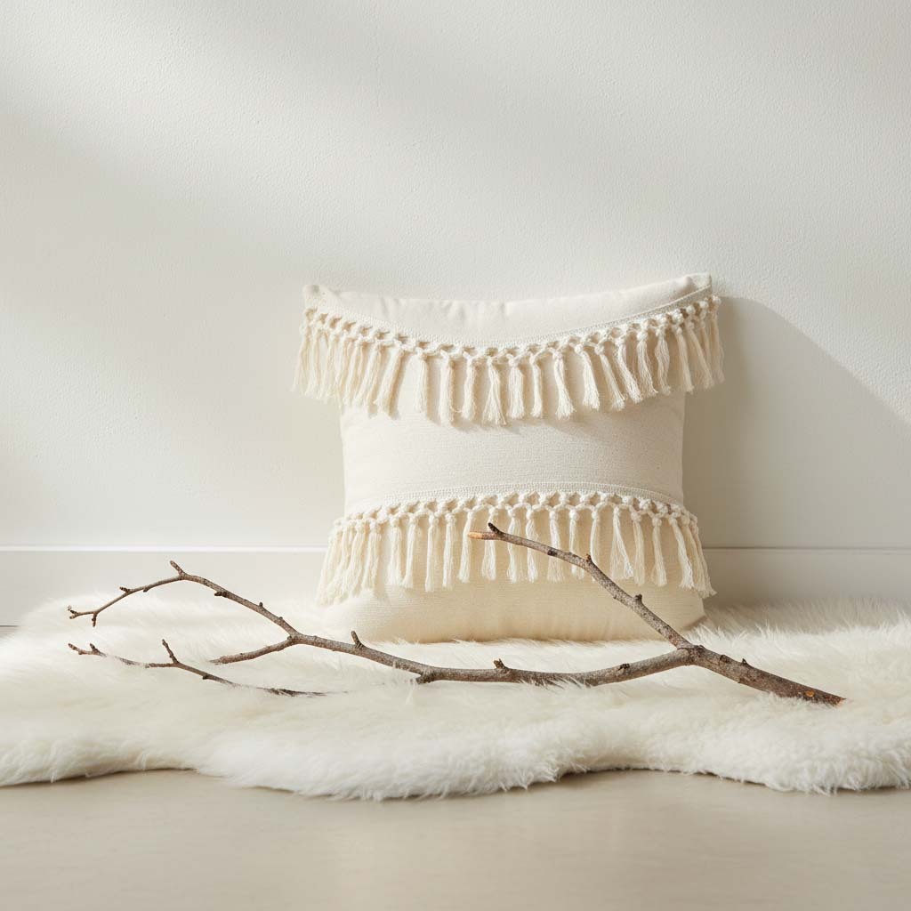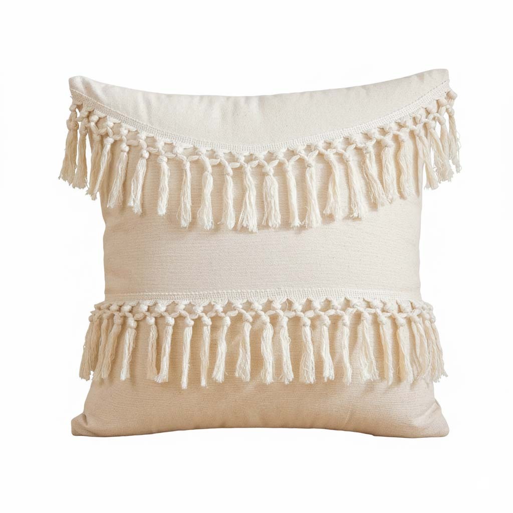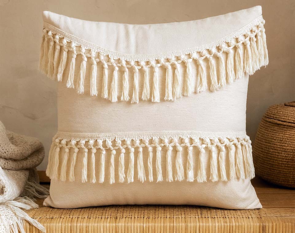 کوسن لنین‌دابل با دو ردیف ریشه های بلند کرمی‌رنگ که به‌صورت افقی روی سطح آن قرار گرفته‌اند، جلوه‌ای گرم و هنری به فضا می‌بخشد. پارچه‌ی لنین روشن و بافت طبیعی آن، حس آرامش و سادگی را منتقل می‌کند، در حالی که ریشه های ضخیم و منظم، بافتی چشم‌نواز و بوهو به طراحی اضافه کرده‌اند. قرار گرفتن کوسن روی سطح حصیری، ترکیب زیبایی از عناصر طبیعی و دست‌ساز را به نمایش می‌گذارد. لنین‌دابل انتخابی‌ست برای کسانی که به دنبال جزئیات خاص، بافت‌های متنوع و حس زندگی در دکوراسیون خود هستند.