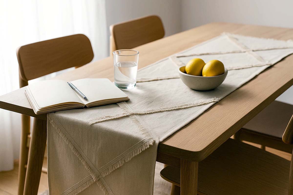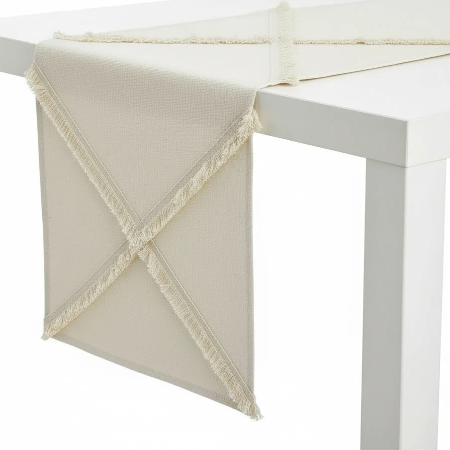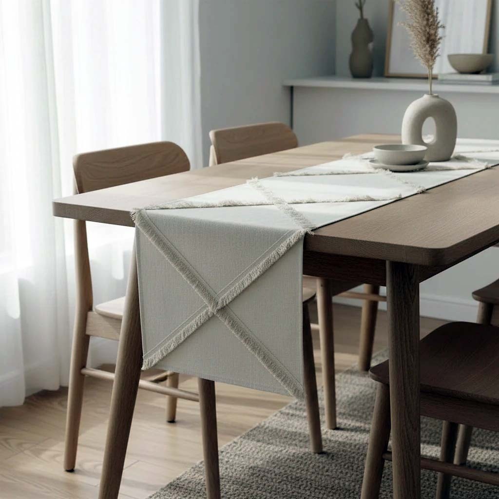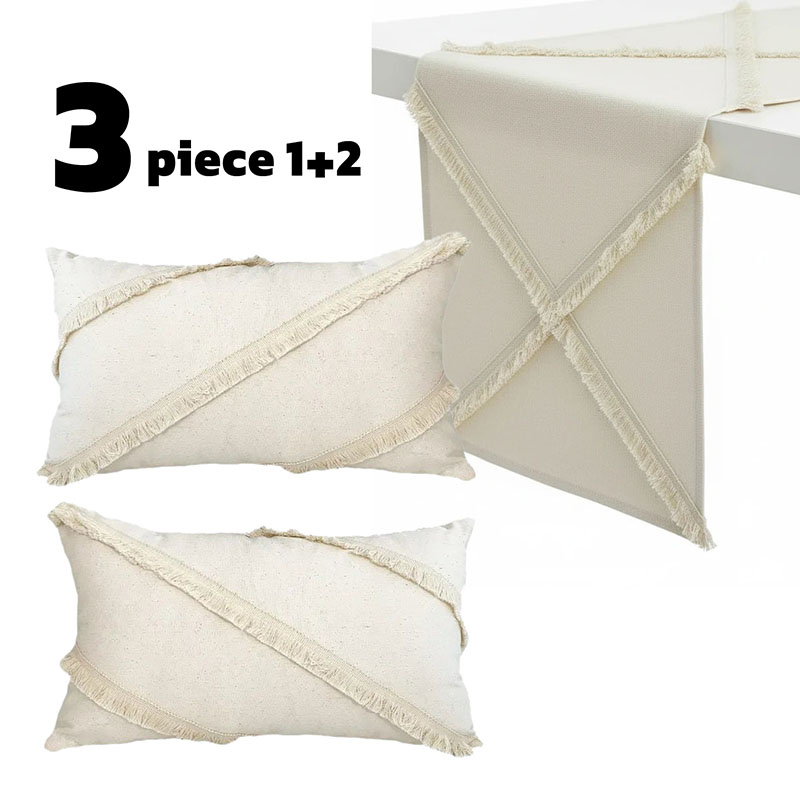 رانر این ست با ابعاد استاندارد و ریشههای کرمی، ظاهری گرم و طبیعی دارد و بهراحتی با سرویسهای پذیرایی چوبی، سفید یا رنگهای خنثی هماهنگ میشود. کوسن نیز با طراحی یکپارچه و زیپ مخفی، امکان استفاده راحت و شستشوی آسان را فراهم میکند. نتیجه، ست کاملی است که فضا را منظمتر، هماهنگتر و شیکتر نشان میدهد.