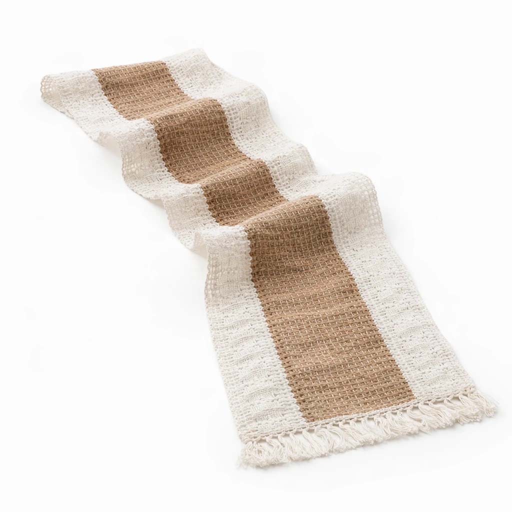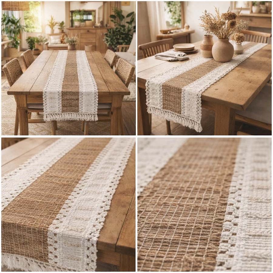 بافت پارچه با جزئیات ظریف و منگولههای نرم در دو سر رانر، حس دستساز بودن و اصالت را تقویت میکند؛ مناسب خانههایی با استایل مینیمال، بوهو و طبیعتگرا.